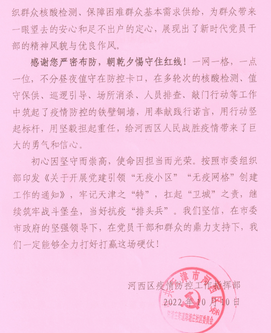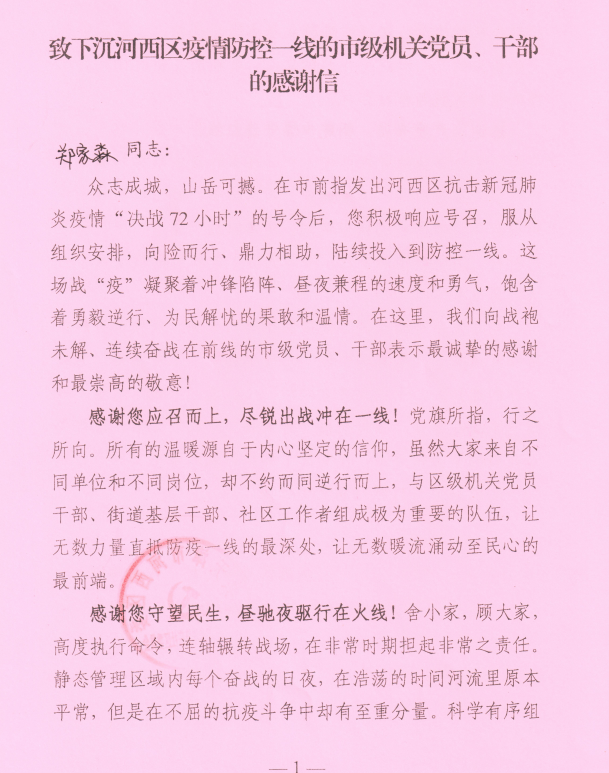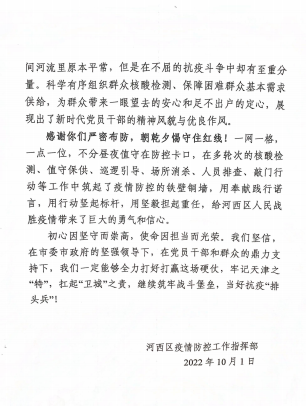 智慧教育研究发展中心党支部郑家淼同志为所在小区的党小组组长,负责组织协调小区的值守防疫工作。郑家淼同志每天凌晨5:00到岗,21:30结束工作,从组织党员干部深入一线值守,到开展流调排查;从疫情防控政策宣传,到疏解社区居民情绪,再到物资供给发放,毫不松懈,严格要求,充分发挥了小组长作用。长时间的管控,使部分居民产生了焦虑心理,个别居民不配合工作,甚至有指责、谩骂的事情发生。面对居民的不理解和冷遇,郑家淼同志总是满带笑容,耐心劝导纾解,尽力化解矛盾。在社区志愿者不懈的坚守和努力下,社区终于在10月1日解封。河西区疫情防控指挥部专门向郑家淼同志发来感谢信,表示最诚挚的感谢和最崇高的敬意。