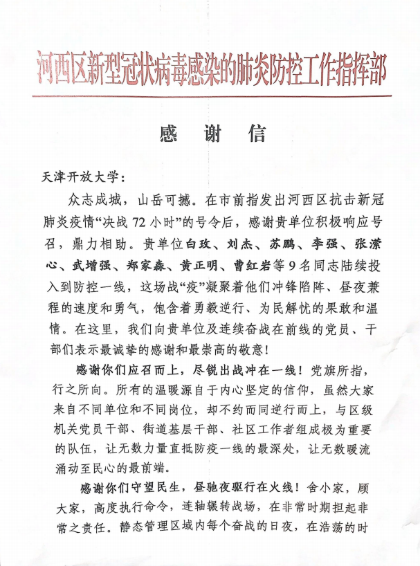 发来感谢信,感谢白玫、刘杰、苏鹏、李强(经管)、张潆心、武增强、郑家淼、黄正明、曹红岩等9名同志,在疫情防控一线冲锋陷阵、勇敢逆行,向乐赢娱乐注册