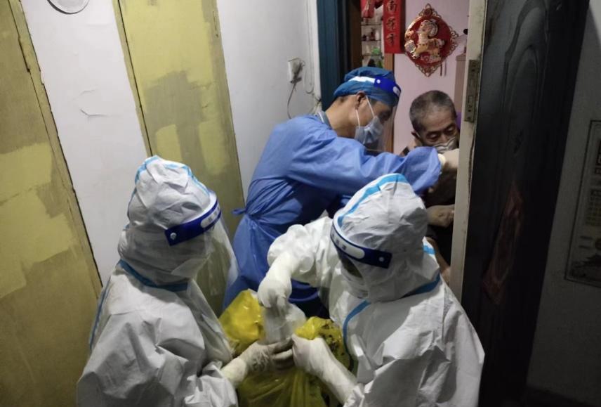 晚上8点半,由于人员紧张,原本3组入户采样的工作被压缩为两组。在30℃高温下,谢馨协助护士完成了4个无电梯老旧小区、50多户的上门核酸检测采样工作,返回大筛现场已是深夜12点。